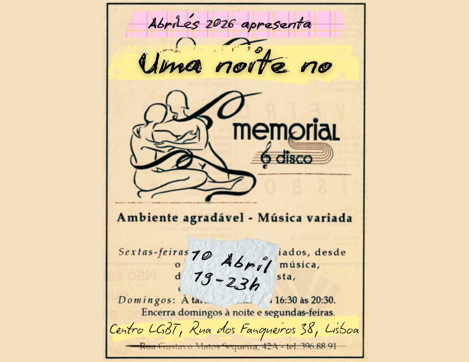 Neste AbriLés, o Centro de Documentação da ILGA Portugal e o blog Arquivo Sáfico propõem celebrar e reconstruir essa memória coletiva, criando uma noite inspirada no Memorial – entre arquivo e pista de dança – como exercício de história pública: recolher, partilhar e ativar memórias em coletivo.