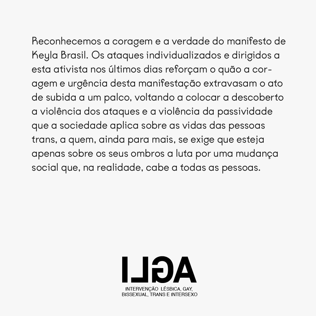 Reconhecemos a coragem e a verdade do manifesto de Keyla Brasil. Os ataques individualizados e dirigidos a esta ativista nos últimos dias reforçam o quão a coragem e urgência desta manifestação extravasam o ato de subida a um palco; voltando a colocar a descoberto a violência dos ataques e a violência da passividade que a sociedade aplica sobre as vidas das pessoas trans, a quem, ainda para mais, se exige que esteja apenas sobre os seus ombros a luta por uma mudança social que, na realidade, cabe a todas as pessoas.