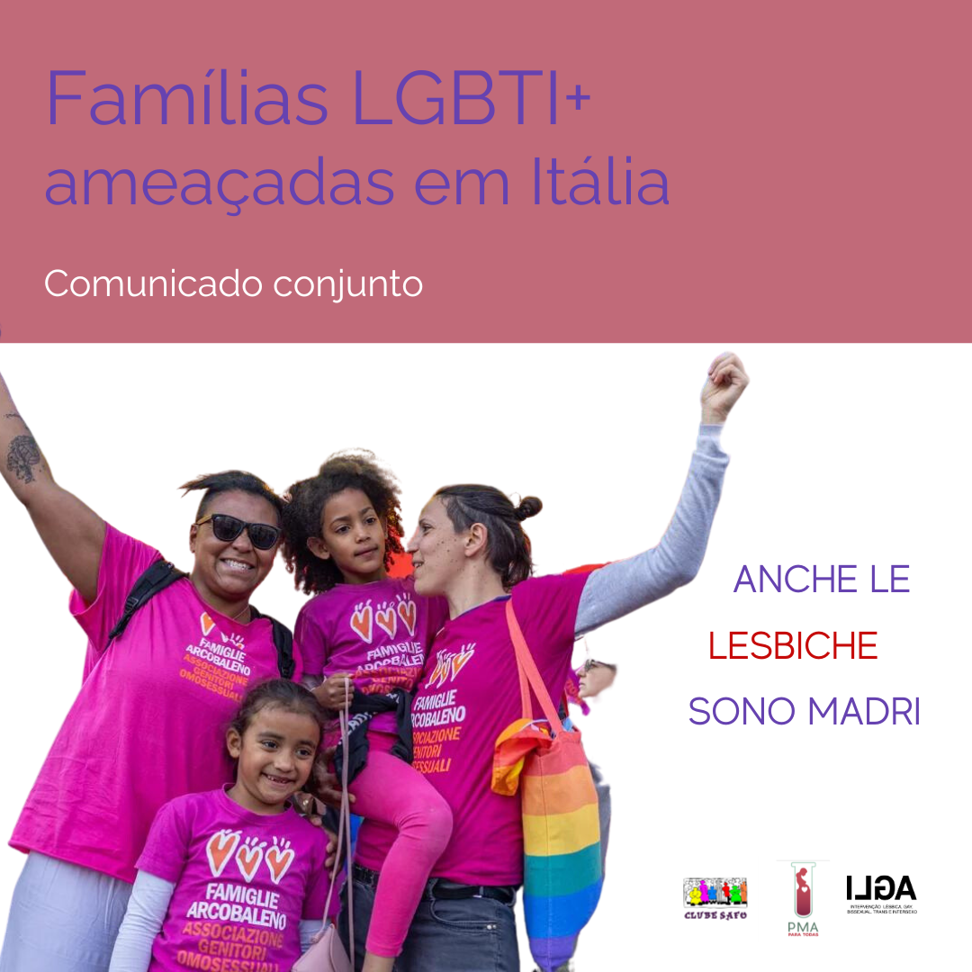 A Associação ILGA Portugal, o Clube Safo e o coletivo PMA para Todas estão solidárias com as famílias LGBTI+ (nomeadamente as constituídas por lésbicas) em Itália e com as Organizações Não Governamentais de Direitos LGBTI+ neste país, incluindo a Famiglie Arcobaleno, manifestando uma profunda preocupação e repúdio em relação à decisão do Ministério Público italiano de ordenar a retirada do nome de mães não-biológicas das certidões de nascimento de crianças filhas de casais do mesmo género e de ilegalizar estas e todas as futuras famílias.