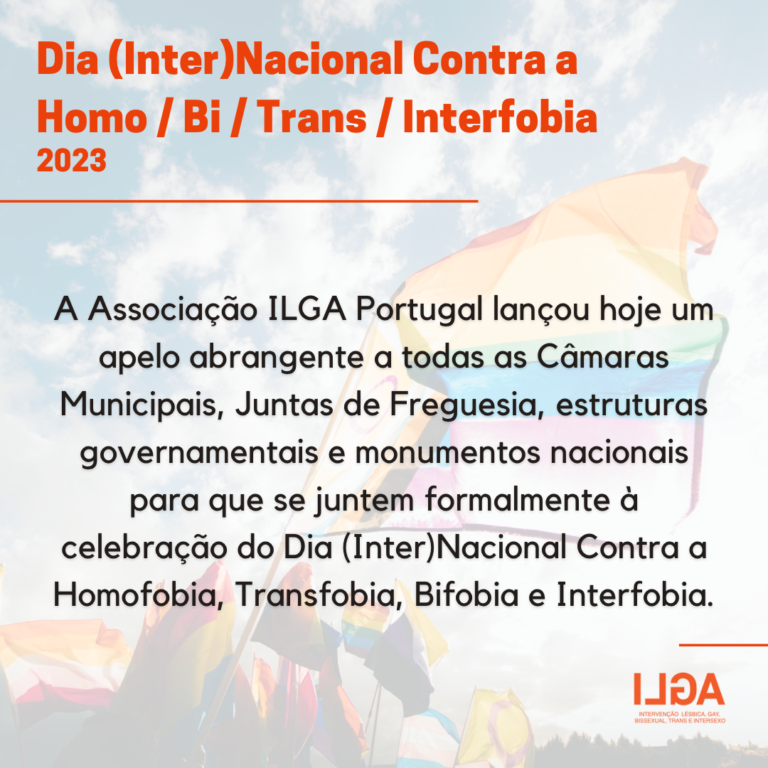 A Associação ILGA Portugal lançou hoje um apelo abrangente a todas as Câmaras Municipais, Juntas de Freguesia, estruturas governamentais e monumentos nacionais para que se juntem formalmente à celebração do Dia (Inter)Nacional Contra a Homofobia, Transfobia, Bifobia e Interfobia.