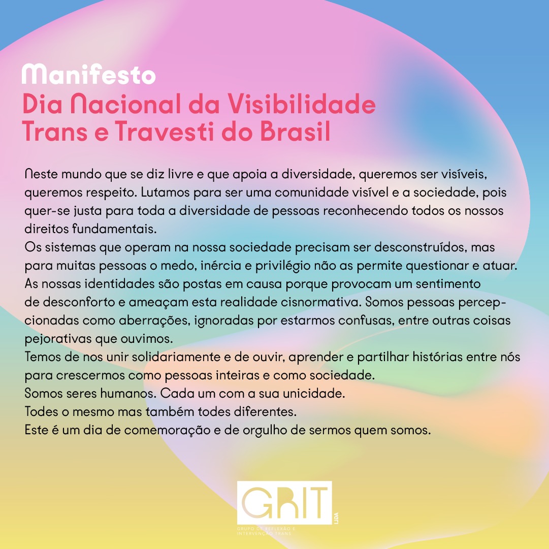 O Brasil, em 2023, ocupa o 1.° lugar no ranking mundial de assassinatos de pessoas trans pelo 14.° ano consecutivo. O GRIT – Grupo de Reflexão e Intervenção Trans da ILGA Portugal – escreve este manifesto como uma forma de denunciar o crescente número de assasinatos e violências diversas, sejam morais e físicas e mortes com crueldade deliberda, um genocídio da população trans residente no Brasil. A maioria das travestis e transexuais têm apenas o trabalho sexual compulsório – sem segurança ou qualquer reconhecimento de direitos – como fonte de renda. Simultaneamente, o Brasil é o país que mais consome transpornografia.
