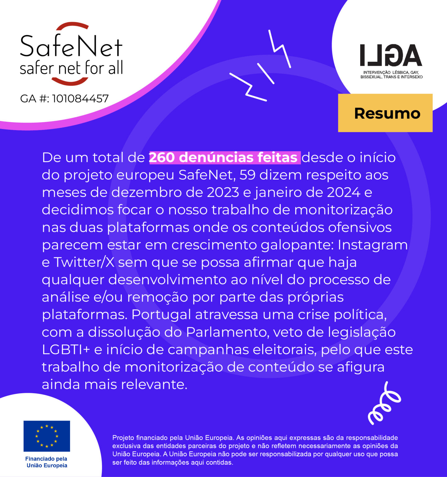 Nestes nove meses de monitorização, fizemos 260 denúncias, e focámos as denúncias de dezembro de 2023 e janeiro de 2024 nas plataformas que parecem oferecer mais espaço para o crescimento do discurso de ódio: o X e o Instagram. Como podes verificar nas imagens, o tempo de resposta às denúncias é elevado, ultrapassando as 24 horas de espera na maior parte dos casos. A taxa de remoção é também bastante baixa, evidência de algo que se tem vindo a discutir há bastante tempo: as políticas de comunidade de ambas as redes sociais são demasiado permissivas e a capacidade de análise é reduzida. Relativamente à motivação do discurso, vemos que mantém as mesmas tendência do relatório anterior, com uma subida do motivo “Anti-LGBTI”. Estes dois meses representaram um período conturbado na política e sociedade portuguesas, com o início da campanha eleitoral das eleições legislativas, o veto da legislação LGBTI+ e uma onda de protestos nas ruas por variadas questões de Direitos Fundamentais.