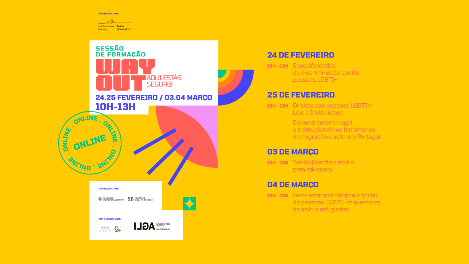 No âmbito de implementação do projeto Way Out – Aqui Estás Segur@, financiado pelo Programa Cidadãos Ativ@s / Active Citizens Fund, e em parceria com as associações Amplos e Queer Tropical, vamos realizar uma segunda sessão da formação sobre “Apoio na migração de asilo de pessoas LGBTI+” nos próximos dias 24 e 25 de fevereiro e 3 e 4 de março.